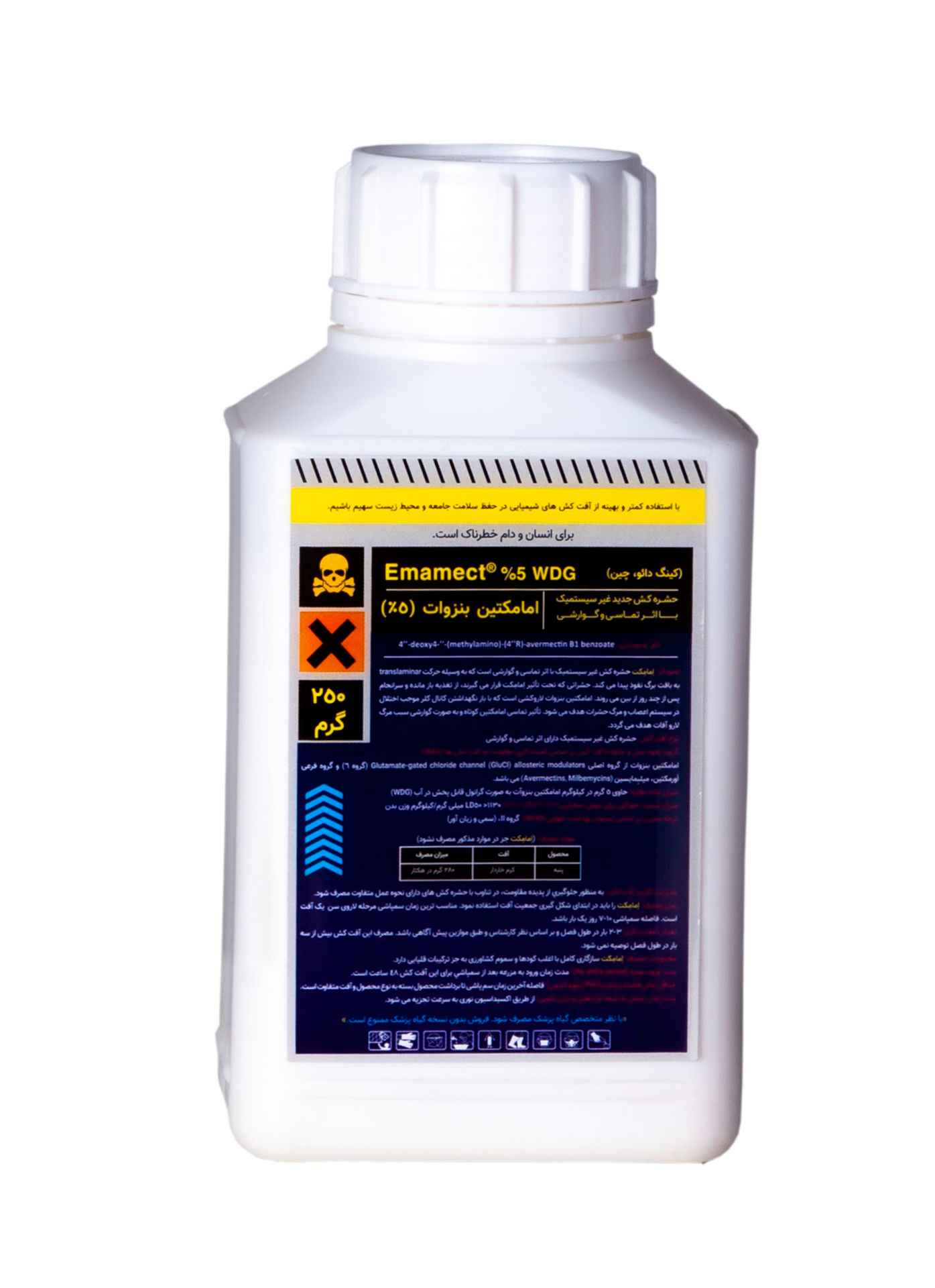 میزان ماده مؤثره: حاوی ۵ گرم در لیتر امامکتین بنزوآت به صورت گرانول قابل پخش در آب (WDG)